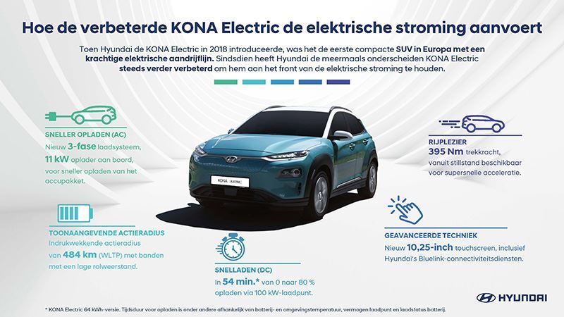 De Hyundai KONA Electric is leverbaar met een 11 kW 3-fase oplader die geschikt is voor openbare 1-fase en 3-fase wisselstroom (AC) laadstations en het oplaadpunt thuis. Daarmee zijn de laadtijden beduidend korter: 100 procent opladen in 4 uur en 50 minuten voor de 39 kWh-versie van de KONA Electric (64 kWh-versie: 7 uur en 30 minuten). Via snelladen (DC, gelijkstroom) is de lithium-ion-polymeerbatterij van zowel de KONA Electric 64 kWh-versie als die van de 39,2 kWh-versie in minder dan een uur (54 minuten) tot 80 procent van zijn capaciteit op te laden (afhankelijk van de batterij- en omgevingstemperatuur, het vermogen van het laadpunt en de laadstatus van de batterij). Voor extra gemak van de EV-rijder levert de Hyundai-dealer in samenwerking met Vattenfall diverse oplaadpakketten met laadpunt speciaal voor thuis opladen.