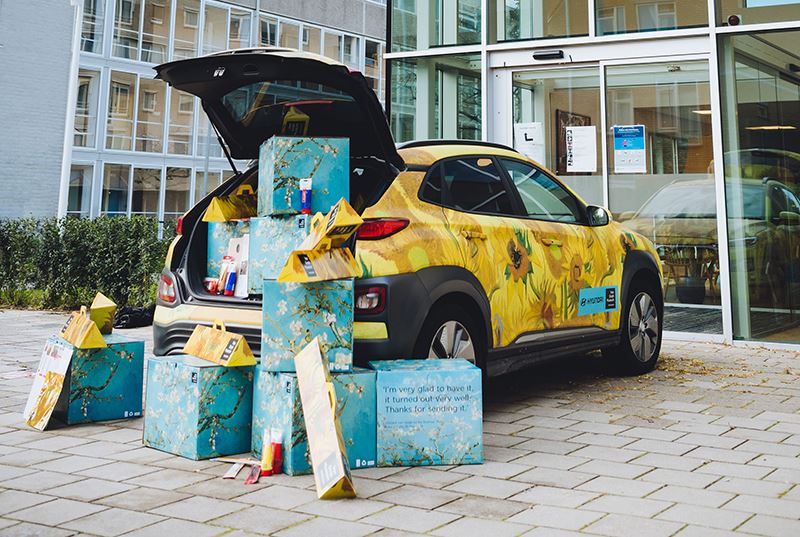 De speciale workshoppakketten worden coronaproof afgeleverd bij de deelnemers, op verschillende locaties in de regio Amsterdam. Dat gebeurt uiteraard geheel in stijl in verscheidene elektrische auto’s van Hyundai – de KONA Electric en de IONIQ Electric – die voor de gelegenheid zijn gehuld in de kleuren van schilderijen van Van Gogh.