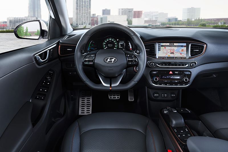Het was zijn eerste kennismaking met de Hyundai IONIQ Electric. ‘Hij ziet eruit als een ‘normale’ auto, dat ben ik als ervaren elektrisch rijder niet gewend. De auto heeft een overzichtelijke indeling, elektrisch verstelbare leren stoelen met verwarming en een sportief gevormd stuur met bediening.’