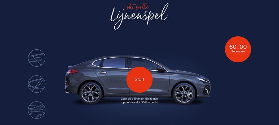 Vind jij de Hyundai i30 Fastback ook zo’n mooie verschijning? Speel dan het Snelle Lijnenspel. De bedoeling is dat je zo snel mogelijk drie kenmerkende lijnen in het design vindt. Lukt dat binnen 60 seconden, dan maak je kans op een citytrip naar keuze ter waarde van € 500,-. Deze actie loopt t/m 31 mei 2018.